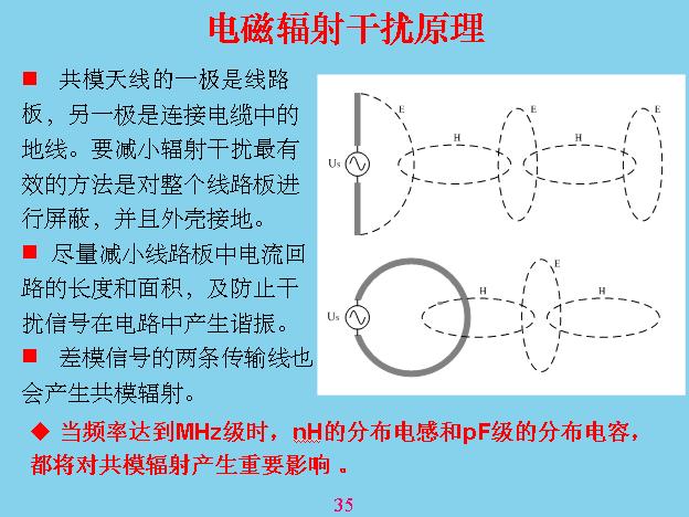 電磁輻射干擾原理。主要也是有兩種,一種是電場輻射,電場輻射最典型的就是半波陣子,如果上面這根天線的波程是半個波程,電場是最大的,現(xiàn)在一般都很少有半波程,有一段接大地,有一端作為發(fā)射天線,像中波天線就是這樣,電信天線就是半波陣子。還有一個是磁場天線,磁場天線相當(dāng)于變壓器的回路,不過這個天線有參數(shù),或者半波陣子波程最好是半個波程,根據(jù)這個波程發(fā)射,不是隨便的,長的短的效果是不一樣的。電磁輻射產(chǎn)生這兩個陣子還會充放電,一下子到正,一下子到負,相當(dāng)于電容。充放電在這里會產(chǎn)生磁場,這個磁場又產(chǎn)生電阻,這就是麥格思維,不斷、不斷的傳下去,在這里面的旋度等于面積的強度,這就是麥格思維方程。電磁波傳播是這樣的,輻射原理主要是這個原理。