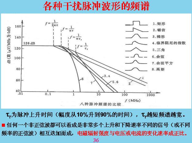 各種干擾脈沖波形的頻譜。輻射和干擾的頻率有關(guān),頻率一般都是指正弦波,這樣比較好理解,對于方波或正弦波的波形,一般我們都可以把它看成是無窮多個上升率不同的波形進行疊加,也就是用基數(shù)展開,這是數(shù)學(xué)表達方式,比較正確是用不同的上升率,不同的波形進行疊加,但上升率不好理解,一般都是用正旋波表示。這里面波種不同的波形,它產(chǎn)生的干擾不一樣。這種的頻譜是最寬的,這種是高新的,接近于正弦波。120dB的時候是1v,126dB就是2v,大家知道dB是什么嗎?它一般用來表示放大倍數(shù),就是輸出電壓與輸入電壓之比,取數(shù)值大于20。為什么用這個倍數(shù)來比?用倍數(shù)比相當(dāng)于把視角范圍縮小,讓你好看,如果從線性來看,一個毫伏一直到兩伏就沖到天上去了,不好看。用對數(shù)坐標(biāo)表示,越往下越壓縮,前面是壓縮比較小,這邊也是。這里變成10,變成了100,變成1000,這是在電工里面用量表示,用倍數(shù)表示,每6dB就差1倍,大家記住。這里是60÷20=3,是3個據(jù)波,這里是1000微伏,120是正極,1V+6dB=2v。到測試所去測試給一個曲線,很多人問我dB是什么意思?dB就是一個坐標(biāo),后面會加一個單位,一個毫伏0dB就是一個毫伏。功率不是20倍表示了,而是用10倍表示,每3dB差一倍功率,電壓就是每6個dB差一倍。