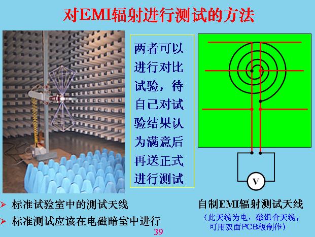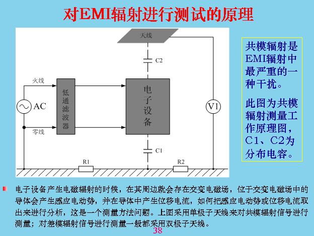 另外對于輻射干擾,我們最注意的就是共模干擾,差模干擾相對來說比共模干擾小很多,我們做過一個試驗,在同一個導(dǎo)線里面流過的電容,相差的共模干擾是2500倍。上面就是對輻射進行測試,剛才是共模干擾,其他都是傳導(dǎo)測試,其實就是輻射干擾測試,一般就是用天線來測,天線的測試原理就是這樣的,量天線和大地之間的電壓,這個設(shè)備與大地之間有分布電容,前面已經(jīng)說過了,放這個在上面,與板接地產(chǎn)生分布電容。天線也有分布電容,分布電容不是跟設(shè)備大小和距離有關(guān),所以測試的時候都有一個標(biāo)準,固定設(shè)備中間距離有多遠,天線面積用多大,還有一套天線,很多天線,不只是一個,計最大的那個,就是測試電壓最大的那個,天線對輻射會產(chǎn)生諧振。
