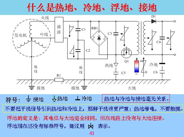 我們后面再講很具體的電路問題。很多人對地的概念不是很清楚,也不了解,現(xiàn)在很多人都把電路里面的公共關(guān)說成地,具體是不是?我們先介紹幾個概念。一般按照道理,最早地就是大地,后來地慢慢習(xí)慣用到設(shè)備里面,包括外殼、輸入線,比如說示波器或者信號線,與大地連在一起,有的不連,現(xiàn)在就變成了一個很模糊的概念,我們就把熱地、冷地、浮地、接地幾個概念簡單介紹一下。這個符號是比較標(biāo)準的接地符號,就是接大地的,不管哪個設(shè)備接地都是這個符號。熱地國家還沒有標(biāo)準,大部分都習(xí)慣用這個箭頭作為熱地。冷地國家也沒有標(biāo)準,大家都接受是這樣的,這三個地基本上電工里面都有明確定義的,這個地就是接大地,熱地就是里面整流出來電源的某一端是公共端,人去摸它會帶電,會電死人,和前面的火線會產(chǎn)生回路電流,會電到人,所以這個叫做熱地。還有一個通過電子耦合以后沒有電的關(guān)聯(lián),只有磁場關(guān)聯(lián),你去量根本沒有回路,叫做冷地,手是可以摸的。但是你不要以為它是冷地就不帶電,實際上它還是帶電,為什么帶電?大家可能一下子不是很清楚,它帶的是靜電,相當(dāng)于極化帶電,就是線圈通過感應(yīng)以后,一頭帶負的,一頭帶正的。電容機也是,有一頭帶電,有一頭不帶電,這一點還是帶負電,不帶電的沒有跟電路連接,定位與大地一樣,所以叫做浮地。對應(yīng)的不是與大地相等,但沒有與大地連接,拿電表來量這一點與大地沒有電壓。浮地的信號現(xiàn)在還沒有,如果大家參考的話可以參加這個符號來用,這個地方電位等于零,當(dāng)兩邊發(fā)生變化就用這個來表,對電路分析有好處,特別是嚴重干擾的時候一定要把浮地找到,因為電位越高的地方電容越容易干擾,電位等于零,也就是浮地和電位是越低的地方干擾就越小。