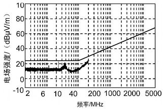 對(duì)RE102 試驗(yàn)項(xiàng)目進(jìn)行觀察,發(fā)現(xiàn)測(cè)試結(jié)果圖的超標(biāo)點(diǎn)為24 MHz、36 MHz 兩點(diǎn),而這兩點(diǎn)分別是12 MHz 頻率點(diǎn)的二三次諧波。為了找到這一頻率點(diǎn)的元器件,對(duì)機(jī)箱內(nèi)各單元進(jìn)行了分析,發(fā)現(xiàn)控制保護(hù)單元中有一個(gè)12MHz 晶振,由于晶振屬于高噪聲元器件,能夠產(chǎn)生較強(qiáng)的輻射,從而使其周邊充滿著近場(chǎng)輻射場(chǎng)。如果輻射場(chǎng)內(nèi)有器件或走線,晶振及其諧波信號(hào)將耦合到器件或走線上而輻射出去;再者又發(fā)現(xiàn)控制保護(hù)單元的PCB 板未采取就近接地措施,只是通過(guò)一根長(zhǎng)引線和機(jī)殼地相連,造成信號(hào)的環(huán)路面積增大,產(chǎn)生了很強(qiáng)的輻射,所以對(duì)控制保護(hù)單元采取措施應(yīng)該是行之有效的。首先對(duì)晶振進(jìn)行屏蔽且屏蔽體就近接地,弱化輻射發(fā)射強(qiáng)度; 然后控制保護(hù)單元的PCB 板同樣采取就近接地措施,并且在屏蔽盒出口處的信號(hào)線上安裝一個(gè)鐵氧體磁環(huán),可以將不需要的高頻干擾抑制掉。通過(guò)采取以上措施后,RE102 試驗(yàn)指標(biāo)合格,如圖3 所示。
