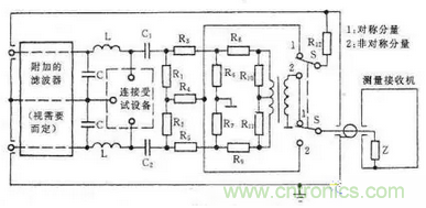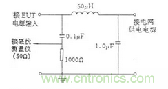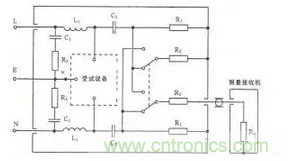 連續(xù)騷擾電壓測量主要測量EUT沿著電源線向電網(wǎng)發(fā)射的騷擾電壓,測量頻率為0.15~30MHz。測量一般在屏蔽室內(nèi)進(jìn)行。測量時需要在電網(wǎng)和EUT之間插入一個人工電源網(wǎng)絡(luò)(LISN或AMN),其原理如圖15所示。AMN的作用是隔離電網(wǎng)和EUT,使測到的騷擾電壓