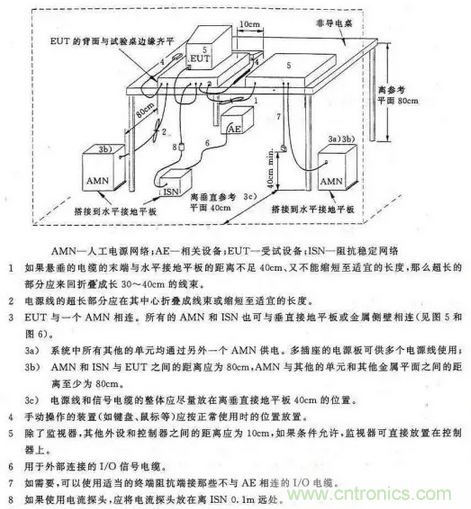 僅是EUT發(fā)射的,不會有電網(wǎng)的騷擾混入。另一作用是為測量提供一個穩(wěn)定的阻抗,因?yàn)殡娋W(wǎng)的阻抗是不確定的,阻抗不一樣EUT的騷擾電壓值也不相同,所以要規(guī)定一個統(tǒng)一的阻抗,通常為50Ω。AMN實(shí)際上是個雙向低通濾波器,電網(wǎng)中的騷擾由50μH和1.0μF的濾波器濾掉,不能進(jìn)人騷擾測量儀,而EUT發(fā)射的騷擾由于50μH濾波器的阻擋不能進(jìn)人電網(wǎng),只能通過0.1μF電容進(jìn)入騷擾測量儀。測量儀的輸入阻抗是50Ω,所以EUT騷擾的負(fù)載阻抗約等于50Ω。對于50Hz的工頻電源,仍然可以通過AMN向EUT供電。圖15中的AMN僅是一種基本結(jié)構(gòu),由基本結(jié)構(gòu)可以組成V型AMN,用于測量電源中相線—地線和零線—地線的不對稱騷擾電壓,見圖16。也可組成Δ型AMN,除了測量線-地間的不對稱騷擾電壓外還可以測量相線—零線間的對稱騷擾電壓,見圖17。測量時EUT和AMN的布置、連接線的長度和走向等都應(yīng)按標(biāo)準(zhǔn)規(guī)定的要求進(jìn)行。AMN外殼要良好接地,否則將影響電網(wǎng)和EUT之間的隔離。圖18為臺式設(shè)備的傳導(dǎo)騷擾測量布置圖。
