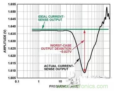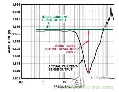 圖2所示為輸入在較寬頻率范圍內(nèi)變化時電流傳感器的直流輸出與其理想值的偏差情況。從圖中可以看出,在1 MHz至20 MHz的頻率范圍內(nèi),偏差最為顯著(》0.1 V),且3 MHz時直流誤差達到最大值(1 V),這在放大器0 V至5 V的輸出電壓范圍中占據(jù)很大比例。