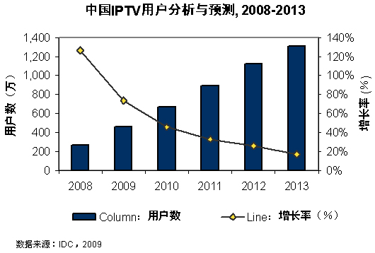 - IDC預(yù)計,2009年中國IPTV用戶將達(dá)到460萬,同比增長73.6%