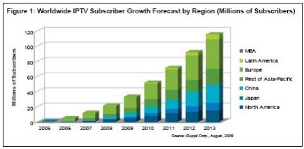 2008 年第四季度和 2009 年第一季度,IPTV 用戶分別增加了250萬和230萬戶。 考慮到這兩個季度被視為當(dāng)前這場經(jīng)濟危機最嚴(yán)重的階段,這是非常驚人的增長。
