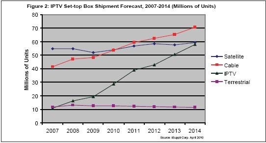 - 預(yù)計(jì)2014年銷(xiāo)往IPTV市場(chǎng)的機(jī)頂盒將增長(zhǎng)到5800萬(wàn)臺(tái)