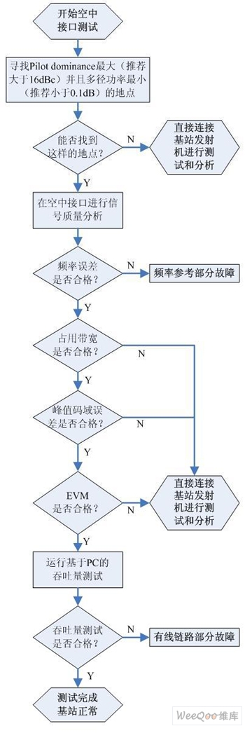 基于方便合理的原則,應(yīng)首先使用空中接口測量方式在合適的地點檢查基站發(fā)射機的信號覆蓋和信號質(zhì)量,爭取在空口測試中對基站狀態(tài)做出準確判斷。如難以判斷空口測量結(jié)果或需要精確測量發(fā)射功率,則需要直接連接基站進行測試。測試步驟如圖2所示。