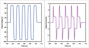 圖2±100V電源時典型的超聲波發(fā)送器輸出,以及流入100Ω和300pF并行負載的相應瞬時電流