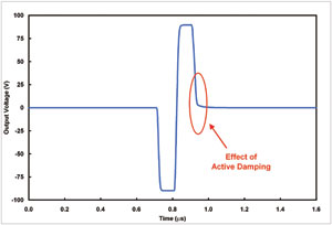 我們可以直觀地理解超聲波發(fā)送器輸出的對稱性要求。然而,這里需要深入理解的是輸出信號不必為一個長脈沖群。它可能包括一個單正極和負極脈沖對,脈沖對的前后均為0V。同樣,信號歸至0V的質量變得至關重要。有時,它被稱為“阻尼”函數(見圖3),并對一些超聲波模式產生巨大的影響,例如,人體非線性為主要信息源的諧波成像等。