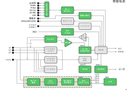 安森美半導(dǎo)體應(yīng)用于智能電表的方案包含一系列標(biāo)準(zhǔn)產(chǎn)品、專用標(biāo)準(zhǔn)產(chǎn)品(ASSP)及專用集成電路(ASIC),可以提供智能電表的4種基本功能,包括:電源/電源管理、計(jì)量、寄存及通信。圖2是由安森美半導(dǎo)體的多種器件(圖中綠色部分)構(gòu)成的智能電表應(yīng)用。