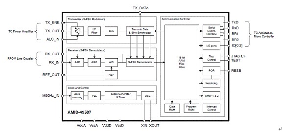 AMIS-49587符合IEC1334標(biāo)準(zhǔn),有助于簡(jiǎn)化設(shè)計(jì)、降低開發(fā)及應(yīng)用成本,并加速上市進(jìn)程。該器件基于ARM7TDMI處理器內(nèi)核,包含物理接口收發(fā)器(PHY)和媒體訪問控制器(MAC)層,而大多數(shù)競(jìng)爭(zhēng)方案都需要復(fù)雜的嵌入式軟件來(lái)執(zhí)行與AMIS-49587相同的功能。該器件采用擴(kuò)頻型移頻鍵控(S-FSK)調(diào)制技術(shù),結(jié)合精確的濾波,為長(zhǎng)距離電力線提供可靠的低數(shù)據(jù)率通信,以及2,400 bps(波特)的半雙工可調(diào)節(jié)通信速率。不到20千赫(kHz)的低工作頻率配以自動(dòng)中繼器(repeater)功能,令通信更可靠,通信誤差比其他及現(xiàn)有方案更低。圖3是AMIS-49587的方框圖。