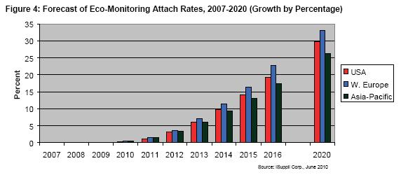 上述每類應(yīng)用的汽車配售率預(yù)計(jì)都會(huì)增長(zhǎng),2010-2013年增長(zhǎng)比較緩慢,隨后從2014年開始基本以兩位數(shù)的速度增長(zhǎng),直到2020年末。iSuppli公司的圖表顯示,節(jié)能監(jiān)測(cè)和節(jié)能建議近期將大幅增長(zhǎng),而由于復(fù)雜性和需要與其它汽車系統(tǒng)整合,節(jié)能動(dòng)力總成的布署比較緩慢。但到2020年,美國(guó)和西歐的節(jié)能動(dòng)力總成應(yīng)用將達(dá)到35%的配售率,接近節(jié)能監(jiān)測(cè)和節(jié)能建議系統(tǒng)的水平。