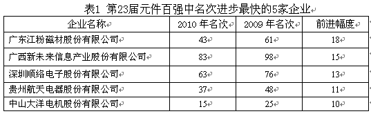 金融危機(jī)造成的企業(yè)經(jīng)營上的波動都反饋到了第22屆、23屆元件百強(qiáng)的榜單上。在近兩屆的榜單之中,均有20多家企業(yè)的名次出現(xiàn)了10位以上(含10位)的較大波動,去年23家,今年21家。據(jù)估計,如果國際國內(nèi)的經(jīng)濟(jì)形勢能保持穩(wěn)定,在未來一兩年內(nèi),元件百強(qiáng)榜單中,名次出現(xiàn)大起大落的企業(yè)數(shù)量將會減少。