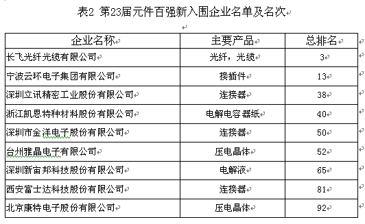 本屆元件百強(qiáng)中共有9家新企業(yè),其中,我國光纖光纜制造業(yè)的龍頭企業(yè)長飛光纖光纜有限公司表現(xiàn)最為突出,一舉斬獲本屆元件百強(qiáng)的季軍寶座。而寧波云環(huán)電子集團(tuán)有限公司、深圳立訊精密工業(yè)股份有限公司、浙江凱恩特種材料股份有限公司、深圳市金洋電子股份有限公司等新入圍企業(yè)均表現(xiàn)不俗。
