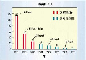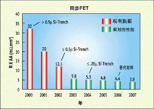 圖2所示的是同步或稱低端(low-side)FET的品質(zhì)因數(shù)。在這里,實際上是傳導(dǎo)損耗主宰了處在導(dǎo)通電阻時域的品質(zhì)因數(shù)。僅在過去的兩年中,通過將1至2微米溝道技術(shù)升級為深亞微米水平,就使品質(zhì)因數(shù)提高了約3倍,今后還有更多的改進(jìn)余地。