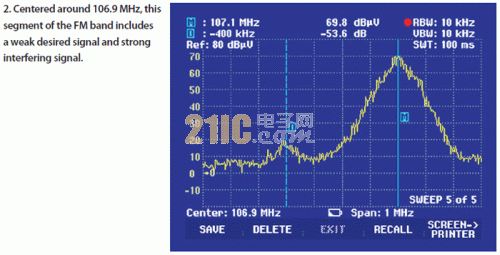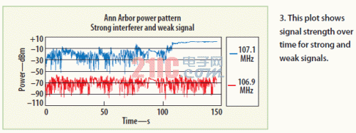 圖1顯示了這次在地圖上的測(cè)試行駛,其中3kW的發(fā)射機(jī)架在高大建筑物的樓頂。雖然天線在直接視線范圍內(nèi),但干擾源處于峰值水平,接收到的106.7MHz目標(biāo)頻率信號(hào)質(zhì)量下降嚴(yán)重。圖2顯示了信號(hào)強(qiáng)度的典型頻譜,圖3顯示了測(cè)試行駛期間2個(gè)信號(hào)的強(qiáng)度。