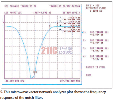 圖5:微波矢量網(wǎng)絡(luò)分析儀測(cè)量到的陷波濾波器的頻率響應(yīng)。