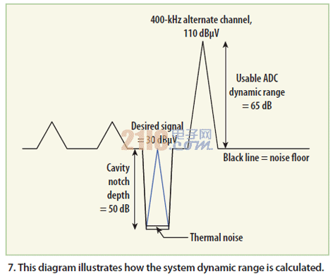 為方便案例分析,假設(shè)目標(biāo)微弱信號(hào)的功率是30dBμV,強(qiáng)干擾源的功率是110dBμV,頻率與目標(biāo)信號(hào)相距400kHz。這將是一個(gè)應(yīng)用于FM收音機(jī)的最嚴(yán)格測(cè)試,也是在測(cè)試行駛的最差部分中遇到的典型情景(圖7)。在這些實(shí)驗(yàn)條件設(shè)定好后,就可以計(jì)算系統(tǒng)的有效動(dòng)態(tài)范圍。在現(xiàn)場(chǎng)ADC記錄動(dòng)態(tài)范圍約65dB、FM腔體陷波濾波器約50db抑制能力下,這個(gè)測(cè)試系統(tǒng)在感興趣頻率點(diǎn)的動(dòng)態(tài)范圍約為115dB。