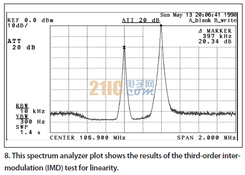在使用系統(tǒng)之前要對(duì)測(cè)量裝置進(jìn)行測(cè)試,以便確認(rèn)測(cè)量裝置不會(huì)引起任何可能降低測(cè)量精度的顯著噪聲或失真。還要通過調(diào)整相對(duì)的插入值對(duì)功率電平進(jìn)行校準(zhǔn)。指定電平在合成器輸出端——收音機(jī)天線連接點(diǎn)進(jìn)行測(cè)量。線性度在要求的信號(hào)電平之上測(cè)量,要做到這一點(diǎn),必須將兩個(gè)發(fā)生器在各自頻率處設(shè)為CW模式,并且總功率電平要超過測(cè)試案例中使用的值。參考圖8,發(fā)生器1被設(shè)為0dBm,發(fā)生器2被設(shè)為-20dBm。這里沒有可測(cè)量的三階互調(diào)(IM3)。圖7描述了被設(shè)為接近最大測(cè)試條件的信號(hào)。