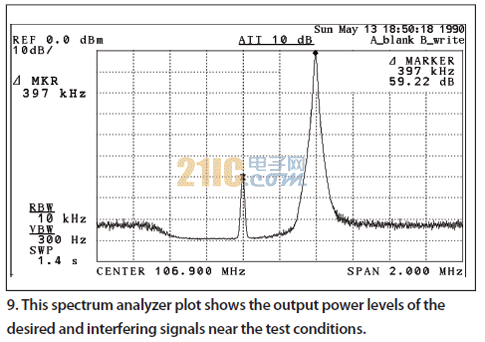 在不同的發(fā)生器1頻率設(shè)置點(diǎn)觀察到以下現(xiàn)象:如果測(cè)試裝置有限制因素,那么音頻的信噪比(SNR)不會(huì)隨著干擾射頻信號(hào)的遠(yuǎn)離而變化。如表所示,接收機(jī)的去靈敏作用是由強(qiáng)大的干擾源引起的,從而證明來自測(cè)試裝置的噪聲不是106.7MHz測(cè)試頻率點(diǎn)的限制因素。