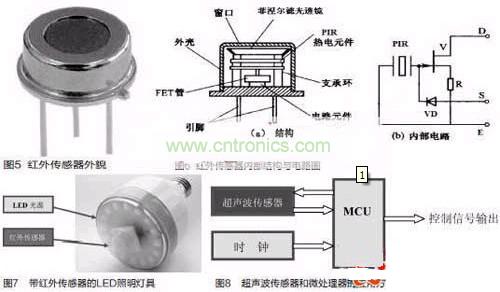 被動式紅外傳感器有三個關(guān)鍵性的元件:菲涅爾濾光透鏡,熱釋電紅外傳感器和匹配低噪放大器。菲涅爾透鏡有兩個作用:一是聚焦作用,即將熱釋紅外信號折射在PIR上:二是將探測區(qū)內(nèi)分為若干個明區(qū)和暗區(qū),使進(jìn)入探測區(qū)的移動物體/人能以溫度變化的形式在PIR上產(chǎn)生變化的熱釋紅外信號。一般還會匹配低噪放大器,當(dāng)探測器上的環(huán)境溫度上升,尤其是接近人體正常體溫(37℃)時,傳感器的靈敏度下降,經(jīng)由它對增益進(jìn)行補償,增加其靈敏度。輸出信號可用來驅(qū)動電子開關(guān),實現(xiàn)LED照明電路的開關(guān)控制。圖5是紅外傳感器外貌,圖6是紅外傳感器內(nèi)部結(jié)構(gòu)與內(nèi)部電路圖。圖7是帶紅外傳感器的LED照明燈具,這是一款E27標(biāo)準(zhǔn)螺口燈頭的燈具,其電源適用范圍是AC180V-250V(50/60Hz),紅外傳感器檢測范圍大約在3m~15m,其標(biāo)準(zhǔn)產(chǎn)品IFS-Bulb3W燈具達(dá)80lm,5W燈具達(dá)140lm.在LED光源模塊的中央部分嵌入紅外線傳感器。一旦紅外傳感器檢測到人的體溫,LED電燈泡將會在50s內(nèi)自動開啟與關(guān)閉。適用于任何一種室內(nèi)應(yīng)用,如走廊、儲藏室、樓梯和大廳入口處。