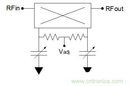 集中的波束無法在需要時導(dǎo)引波束,便用途有限。使用聯(lián)機(jī)相位調(diào)節(jié)電路更改各個元件的相對相位,可以導(dǎo)引波束。圖3顯示了基于變?nèi)荻O管的模擬相位調(diào)節(jié)器電路?;旌像詈掀靼演斎牒洼敵龅幕夭〒p耗保持在合理水平。如果信號路徑包括該電路,RF性能(尤其是互調(diào)失真)會由于變?nèi)荻O管的非線性性能而降低。