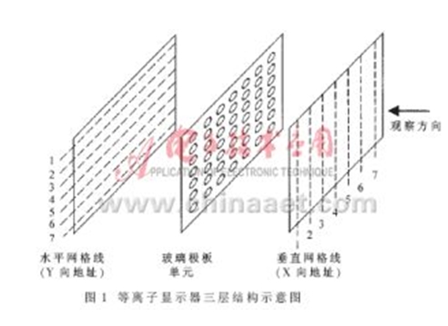 等離子顯示器是一種利用氣體放電的顯示裝置,這種屏幕采用了等離子管作為發(fā)光元件。大量的等離子管排列在一起構成屏幕。每個等離子對應的每個小室內都充有氖氙氣體。在等離子管電極間加上高壓后,封在兩層玻璃之間的等離子管小室中的氣體會產(chǎn)生紫外光,從而激勵平板顯示器上的紅綠藍三基色熒光粉發(fā)出可見光。每個離子管作為一個像素,由這些像素的明暗和顏色變化組合,產(chǎn)生各種灰度和色彩的圖像,與顯像管發(fā)光相似。等離子體技術同其它顯示方式相比存在明顯的差別,在結構和組成方面領先一步。其工作機理類似普通日光燈,等離子顯示器的三層結構如圖1所示。一般由三層玻璃板組成。在第一層的里面涂有導電材料的垂直條,中間層是燈泡陣列,第三層表面涂有導電材料的水平條。要點亮某個地址的燈泡,開始要在相應行上加較高的電壓,等該燈泡點亮后,可用低電壓維持氖氣燈泡的亮度。關掉某個燈泡,只要將相應的電壓降低。燈泡開關的周期時間是15ms,通過改變控制電壓,可以使等離子板顯示不同灰度的圖形。彩色等離子板目前還處于快速發(fā)展階段。