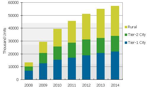 DisplaySearch最新發(fā)表「中國電視市場專題研究報告」,報告指出,在未來五年內(nèi),中國急速的都市化進程,每年約10%左右GDP(國內(nèi)生產(chǎn)總值)成長率,以及到2011年之后,在中國境內(nèi)投資的多家用于液晶電視面板的高世代TFT LCD面板廠的陸續(xù)量產(chǎn),這些關(guān)鍵的積極因素將帶來中國平面電視市場(包含液晶與等離子)維持的高成長。我們預(yù)計,中國平面電視的出貨量將從2009年的3千1百萬臺,大幅成長至2014年的5千9百萬臺,年復(fù)合成長率為14%。而平面電視的市場滲透率將從2009年72%成長到2014年接近100%,傳統(tǒng)映像管電視屆時將完全消失。