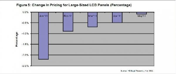 上圖所示為IHS iSuppli公司對1-5月大尺寸LCD面板價格變動的逐月預測。大尺寸LCD面板是指對角尺寸從10.1到55英寸以上的面板。