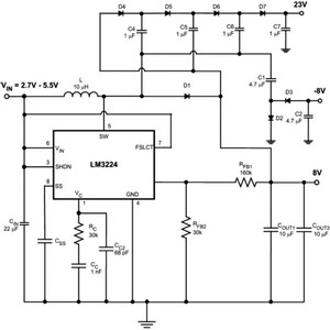 如今各種微型電壓升降壓芯片技術(shù)也日顯成熟,產(chǎn)品也在不斷增加,符合PMP/MP4、DSC、DV的TFT-LCD需要的,能同時(shí)多路輸出它們需要的不同電壓的集成電源管理芯片組(SOC)也在迅速推出之中。TFT-LCD顯示器系統(tǒng)需要多檔電源電壓,如PMP/MP4常用的三星3.5_和4_的TFT-LCD,它們的結(jié)構(gòu)如圖3所示,它們由TFT玻璃(TFTglass)、顏色濾波器(Colorfilter)、顯示區(qū)(Displayarea)、背光板和背光源(Backlight)四部分疊加組成。圖4是三星3.5_的TFT-LCD電路圖。它們的主要技術(shù)參數(shù)是:VIN=2.1-4.0V,VSW=15V/1.4A、VS=15V;用6個(gè)LED串聯(lián)做背光源,每個(gè)LED的VF=3.4V、IF=20mA,因此需要一個(gè)24V/50mA的電壓來(lái)驅(qū)動(dòng)。常常選用帶電感的DC/DC來(lái)升壓,再加上倍壓電路,輸出多檔電源電壓滿(mǎn)足TFT-LCD的需要,如圖5所示。目前MP3、PMP/MP4、DSC、DV等的小尺寸TFT-LCD屏的低成本背光驅(qū)動(dòng)方案常常是采用這種方法來(lái)設(shè)計(jì)實(shí)用電路的。