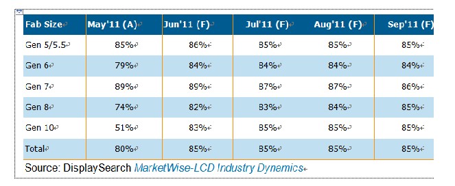 大尺寸TFT LCD面板平均產(chǎn)能利用率在2011年第一季度下降,4月份產(chǎn)能為79%。第二季度市場需求激增,面板商提高產(chǎn)能利用率,6月份將達(dá)到85%。面板商原本計劃在第三季度繼續(xù)提高產(chǎn)能,但因為實際市場情況而不得不改變生產(chǎn)策略。