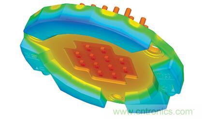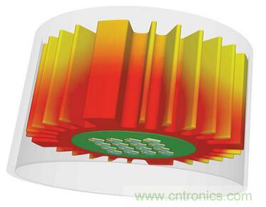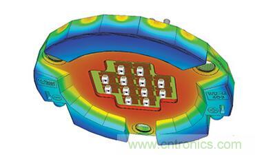LED燈具設(shè)計(jì)師所面臨的挑戰(zhàn)是如何將所有這些東西都放在可用的空間中,同時(shí)確保成品內(nèi)部和外部關(guān)鍵點(diǎn)的溫度保持在可接受的范圍內(nèi)。這時(shí)候,熱模擬就能起到作用,特別是在整個(gè)設(shè)計(jì)過程中。圖2示出了在熱模擬下有良好散熱的芯片模塊范例。