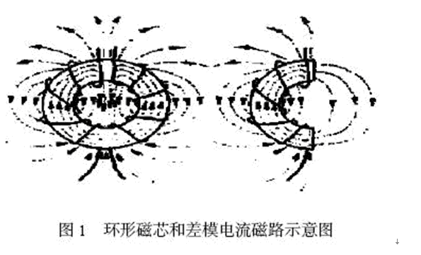 在環(huán)形共模電感的特殊場(chǎng)合中,每條引線中的差模電流密度可假定是相等的,且方向相反。由此而產(chǎn)生的磁場(chǎng)必定在環(huán)形磁芯周邊上的總和為零,而在其外部的總和則不為零。