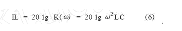 對(duì)于小功率的電子設(shè)備而言,LmaxCy,max的值通常為100μHμF,這是一個(gè)非常小的數(shù)值。以單級(jí)LC濾波器為例,為簡(jiǎn)化分析,用電壓衰減來(lái)代替插入損耗,可得此時(shí)插入損耗為: