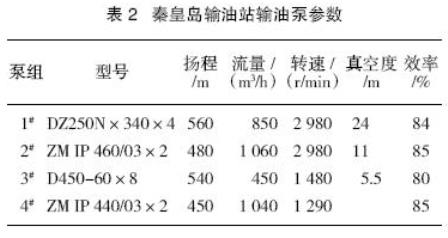 秦皇島輸油站輸油設(shè)備如表2、表3所列。秦皇島輸油站配備4臺(tái)輸油泵機(jī)組,并聯(lián)方式,直接抽10萬(wàn)m3油罐外輸,且只能一臺(tái)泵機(jī)組運(yùn)行。其中1#泵機(jī)組配有液力耦合器調(diào)速裝置,其它3臺(tái)均無(wú)調(diào)速裝置。冀東原油混入后,出現(xiàn)1#、2#、4#泵機(jī)組配置明顯偏大,而3#泵機(jī)組配置又有所偏低的狀況,致使輸油站外輸量降低。目前運(yùn)行中以帶液力耦合器的1#輸油泵機(jī)作為主力,該泵機(jī)組為上世紀(jì)90年代初期國(guó)產(chǎn)產(chǎn)品,效率低,故障率高;而于2003 年與2004年相繼更換的2#、4#泵機(jī)組(進(jìn)口設(shè)備)因揚(yáng)程、排量過(guò)大,目前基本處于閑置狀態(tài)。