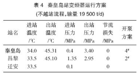 秦皇島站運(yùn)行4#輸油泵節(jié)流損失0.80 MPa,運(yùn)行2#輸油泵節(jié)流損失1.2 MPa,浪費(fèi)很多電能,并且運(yùn)行中這兩臺(tái)泵的震動(dòng)很大。綜合考慮(冀東油田來(lái)油量逐年遞增,秦皇島外輸量逐年遞減,輸量不穩(wěn)定)通過(guò)采用更換或切削泵葉輪的方案解決該站節(jié)流損失的方案不可取,應(yīng)考慮在秦皇島站增加調(diào)速裝置,調(diào)節(jié)揚(yáng)程及輸量。故采用了表4所列的變頻器運(yùn)行方案。