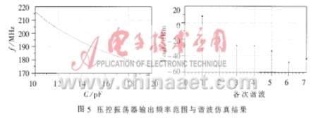 式中,fm為頻偏,KVCO為VCO控制靈敏度,fo為振蕩頻率,Q為品質(zhì)因數(shù),F為晶體管的噪聲系數(shù),K為波爾茲曼常數(shù),T為工作溫度,Ps為振蕩信號功率,fc為閃爍噪聲拐角頻率,Vm為低頻噪聲源的總幅度。從式(5)可以看出,選擇噪聲系數(shù)小的放大管、增加諧振回路有載Q值、減小VCO控制靈敏度、提高輸出信號功率都可以降低相位噪聲。通過減小變?nèi)莨茉谥C振回路中的接入系數(shù),可以有效減小VCO控制靈敏度,但是也會導(dǎo)致頻率覆蓋范圍的減小,所以要適當(dāng)選擇接入系數(shù)。該VCO輸出頻率為200MHz時,變?nèi)莨芙尤胂禂?shù)為0.63。通過適當(dāng)調(diào)整輸出回路的電感和分壓電容,可以提高負(fù)載阻抗,從而有效地提高輸出功率,以達到降低相位噪聲的目的。通過軟件仿真,在頻偏10kHz處的輸出相位噪聲為-101.3dBc/Hz,在100kHz處的相位噪聲為-122.5dBc/Hz。