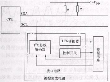 I2C總線(xiàn)上傳輸?shù)氖菙?shù)字信號(hào),如果I2C總線(xiàn)上掛接的被控集成電路為模擬電路,為便于與被控模擬電路通信,在被控對(duì)象中需要增加I2C總線(xiàn)接口電路,受控IC中I2C總線(xiàn)接口電路工作原理圖如圖2所示。接口電路一般由I2C控制器和控制開(kāi)關(guān)等電路組成。由CPU送來(lái)的數(shù)據(jù)信息經(jīng)譯碼器譯碼后控制信號(hào)才能對(duì)被控IC執(zhí)行控制操作。被控對(duì)象通過(guò)I2C總線(xiàn)接口電路接收由CPU發(fā)出的控制指令和數(shù)據(jù),實(shí)現(xiàn)CPU對(duì)被控對(duì)象的控制。