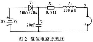 圖2中,V1為低壓直流電源,R1為限流電阻。由V1通過R1提供一個(gè)直流電流給單匝復(fù)位線圈A。在高壓脈沖變壓器工作時(shí),單匝線圈A上會感應(yīng)較高的電壓,利用電感L1,電容C1和高壓硅堆VD1對低壓直流電源V1進(jìn)行保護(hù)。