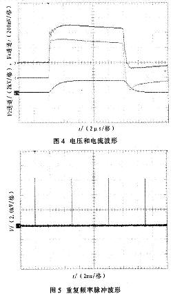 圖4中,縱坐標(biāo)為電壓幅度值(2通道2kV/格,4通道200mV/格)。通道2為電壓波形,電壓約為5kV,脈沖寬度為10μs,上升沿小于lμs。通道4為電流波形,電流值約85A(波形圖中比例為l:500)。圖5中,脈沖周期為5ms,重復(fù)頻率為200Hz。圖6中,縱坐標(biāo)為電壓幅度值(1通道5kV/格,2通道2V/格)。l通道為放電電壓波形,2通道為放電電流波形。從波形圖中可以看出,脈沖當(dāng)電壓加在氣體上時(shí),大約經(jīng)過幾微秒時(shí)間后,氣體發(fā)生電離。此時(shí)由于分壓原因,電壓幅值略有下降,電流波形開始出現(xiàn)。在脈沖電壓加載期間,氣體維持了電離狀態(tài)。