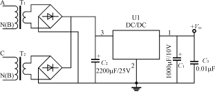 三相電度表有三相三線,三相四線,輸入電壓有3×(220~240)V/380~400V、3×57V/100V等。三相電度表供電電路可以參考單相電度表電源的設(shè)計方法,對于三相四線供電電路,可以在每一相線對零線之間接1只線性變壓器,共3只線性變壓器;對三相三線可以取一相如Β相作為公共地線,A、C相對Β相接2只線性變壓器。這些變壓的副邊單獨整流后再將輸出的正極接在一起、負極接在一起,經(jīng)電容濾波后,再通過DC/DC變換器輸出穩(wěn)定電壓,向電度表供電,如圖5所示。