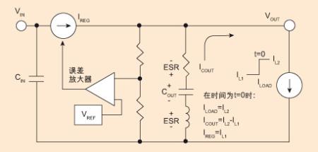 在穩(wěn)壓器的電流源被控制環(huán)路調(diào)整到新值之前的時間間隔內(nèi),ESR兩側(cè)的分壓降低了輸出電壓(這段時間內(nèi)COUT放電電荷量也會相應(yīng)有所減少)。