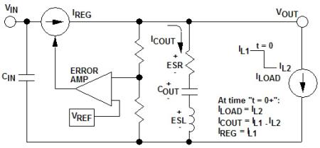 穩(wěn)壓器的電流源(IREG)不能立即發(fā)生變化,因此在“t = 0+”時刻(也就是負(fù)載電流增加到IL2的瞬間),IREG = IL1。通過簡單節(jié)點分析得出,此時電流源需要輸出電容: