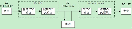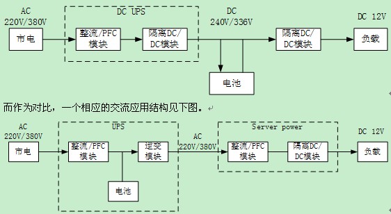 在UPS應用的另外一個分支是目前正在興起的直流UPS系統(tǒng)。直流系統(tǒng)的思路是出于提高效率的目的,減少電源系統(tǒng)中間的轉換環(huán)節(jié),電力分配部分由原來的交流轉換成直流。一個理想的直流UPS系統(tǒng)服務器應用從市電到12V終端的應用結構見下圖。