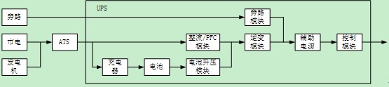 從單個UPS的設計來說,可以把整個產(chǎn)品按照模塊進行劃分,下面圖中是一個典型的UPS系統(tǒng)結構圖