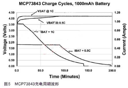 利用MCP73843在1C和0.5C恒流充電速率下的整個充電周期如圖5.以0.5C而不是1C速率充電時,充電結(jié)束的時間大約晚了一個小時。充電終止電流從0.07C降到0.035C,使得最終電池容量從~98%增長到~100%.系統(tǒng)設(shè)計師必須在充電時間、功率損耗和可用電池容量之間進(jìn)行權(quán)衡。