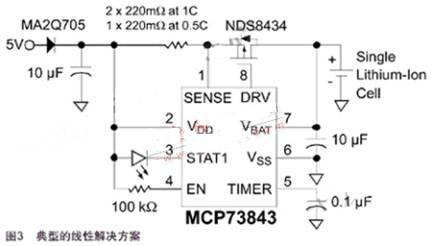 例如,應(yīng)用中需要利用一個5V ±5%的輸入電源以0.5C或1C的恒定電流對一個1000mAh的單節(jié)鋰離子電池充電。圖3顯示了如何利用Microchip的 MCP73843構(gòu)成一個低成本的獨(dú)立解決方案,只需要極少量的外部元器件,就可以實(shí)現(xiàn)所需要的充電算法。MCP73843完美地結(jié)合了高精度恒流充電、 恒壓穩(wěn)壓以及自動充電終止等功能。