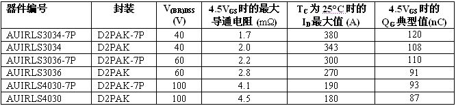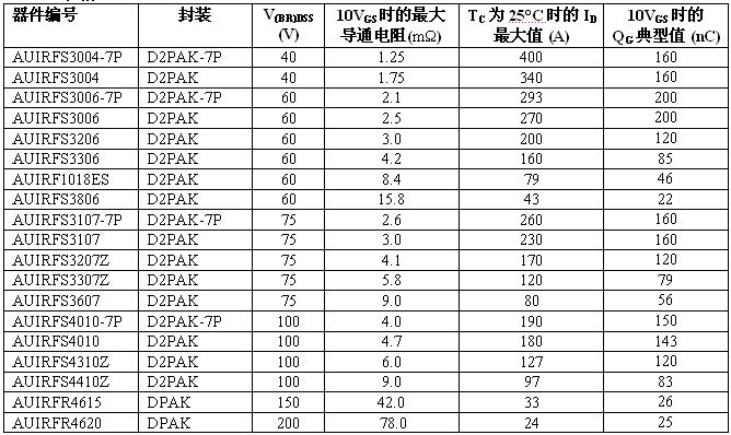 全新溝道 HEXFET 功率 MOSFET 系列采用多款表面貼裝器件 (SMD) 封裝,電壓范圍從 40V 至 200V。標(biāo)準(zhǔn)和邏輯電平柵級(jí)驅(qū)動(dòng) MOSFET 都為 IR 車用塑料封裝 MOSFET 產(chǎn)品系列設(shè)定了導(dǎo)通電阻性能新標(biāo)準(zhǔn)?;鶞?zhǔn)導(dǎo)通電阻在 40V 下最大為 1.25 毫歐,60V 下最大為2.1 毫歐,75V 下為 2.6 毫歐,100V 下為 4.0 毫歐。在 D2Pak-7P 封裝中許多器件的最大額定電流達(dá) 240A。