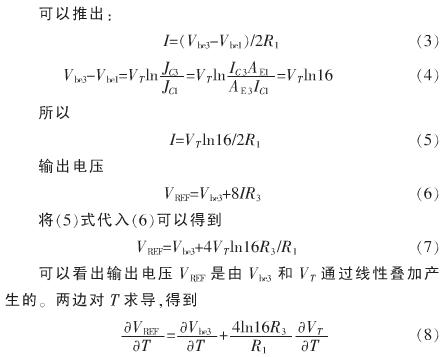 本文提出的電路核心結(jié)構(gòu)如圖1所示,在電路中雙極晶體管構(gòu)成了電路的核心,實(shí)現(xiàn)了VBE與VT的線性疊加,獲得近似為零溫度系數(shù)的輸出電壓。圖1中雙極型晶體管Q1和Q2的發(fā)射區(qū)面積相同,Q3和Q4的發(fā)射區(qū)面積相同,考慮設(shè)計(jì)需求,取Q1和Q2的發(fā)射區(qū)面積為Q3和Q4的發(fā)射區(qū)面積的8倍。